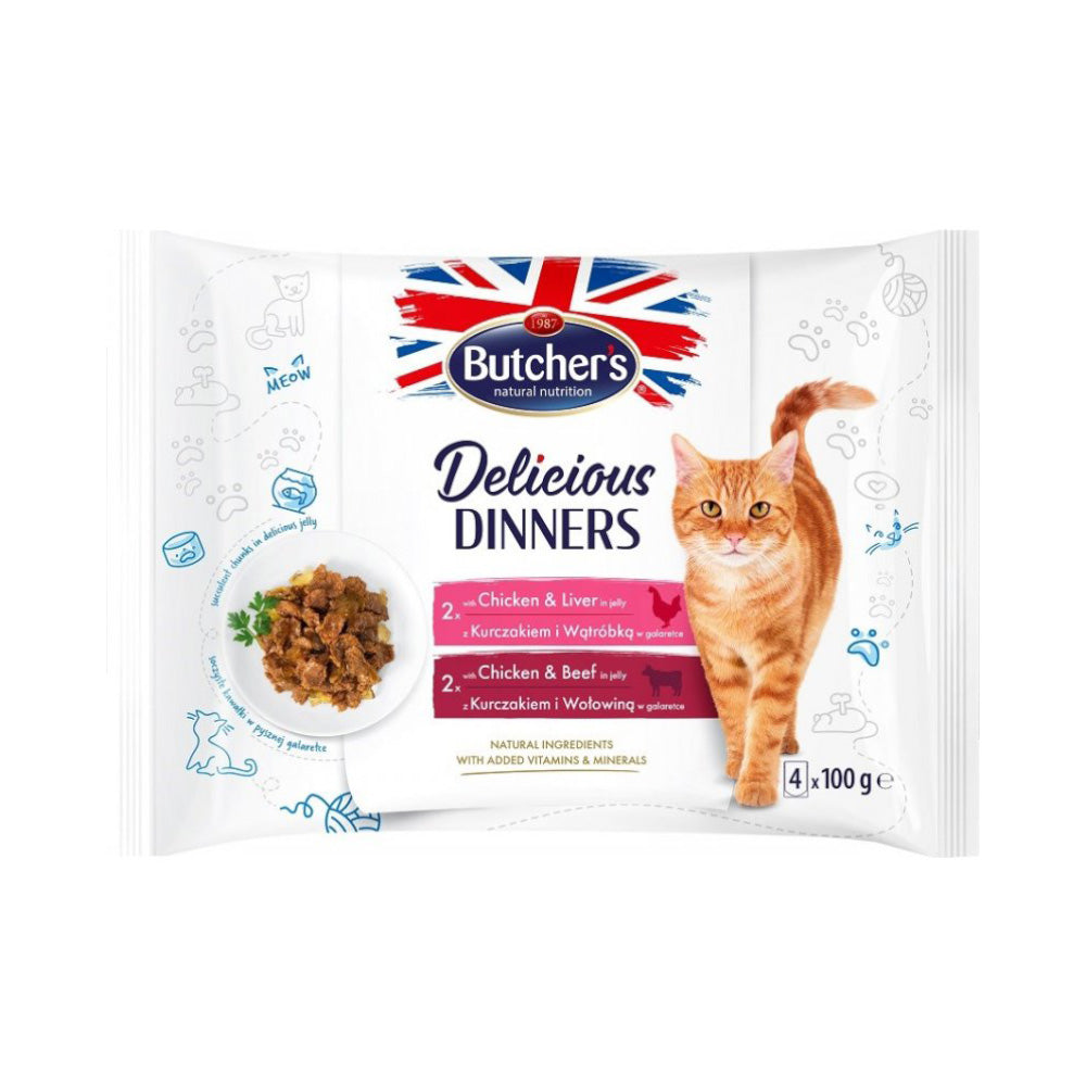 بوتشرز طعام رطب للقطط البالغة بنكهة الدجاج مع الكبدة والدجاج مع اللحم البقري بالجيلي 400غ