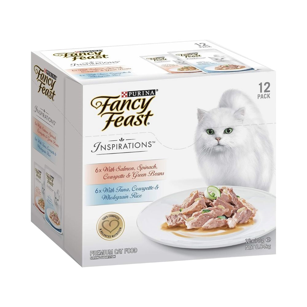 بيورينا فانسي فيست إنسبيريشنز تشكيلة طعام رطب للقطط بنكهة السالمون والسبانخ والكوسة والفاصوليا الخضراء مع التونة والكوسة والارز 70غ